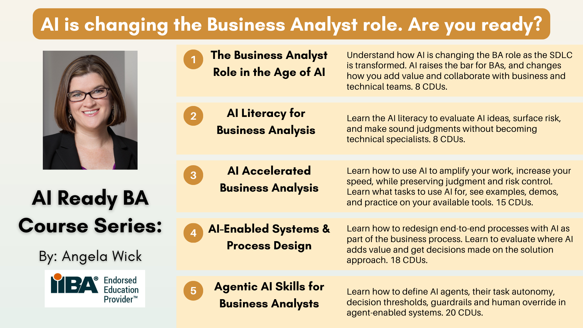 Angela is also a LinkedIn Learning Instructor, reaching learners around the world through highly rated courses on agile analysis, product ownership, and the evolving role of AI in business analysis. Her AI-focused courses help BAs understand how to work alongside emerging technologies while staying grounded in real user needs.